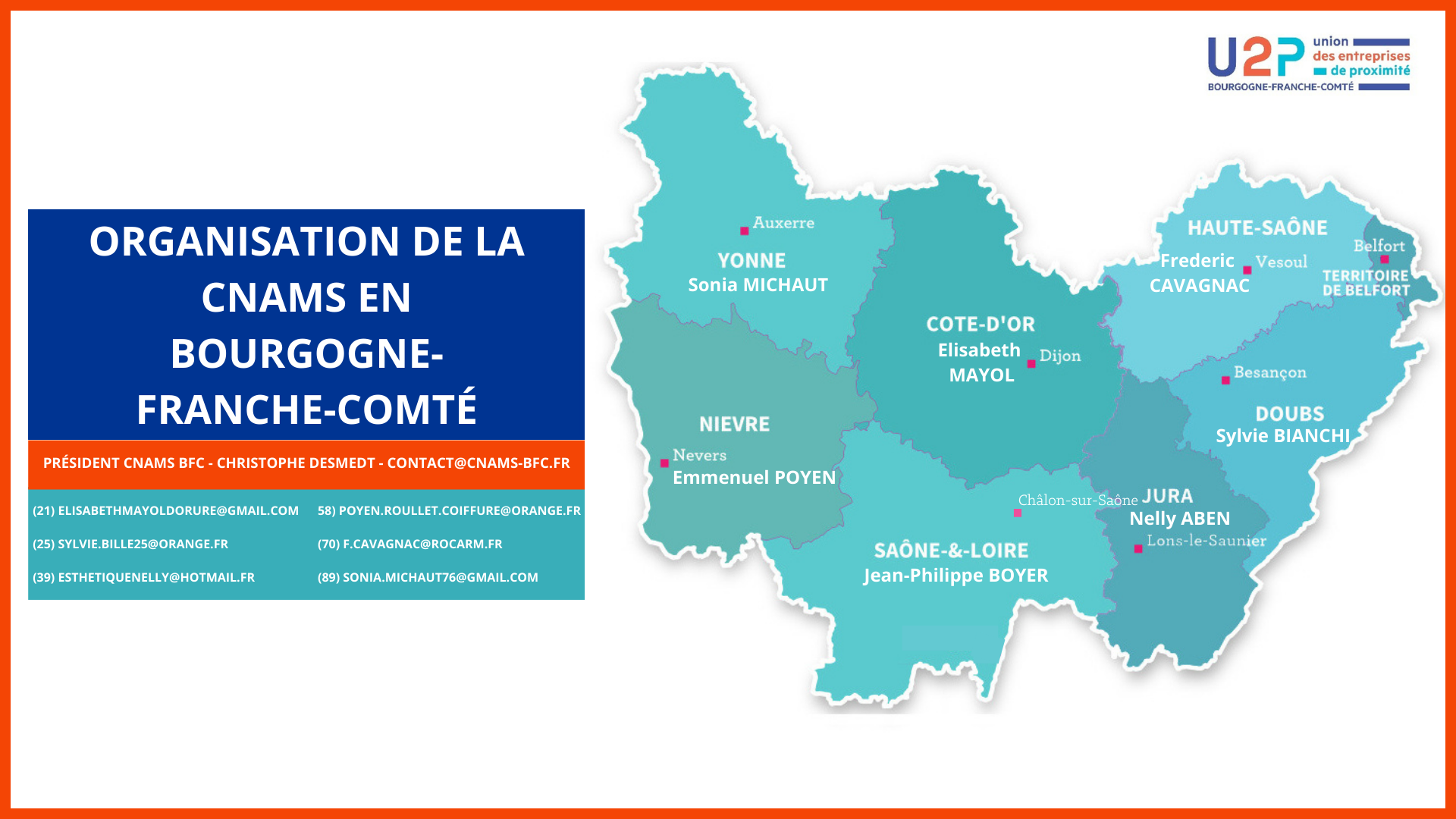 Retrouvez l'organisation et les contacts de la CNAMS en Bourgogne-Franche-Comté sur la carte suivante.